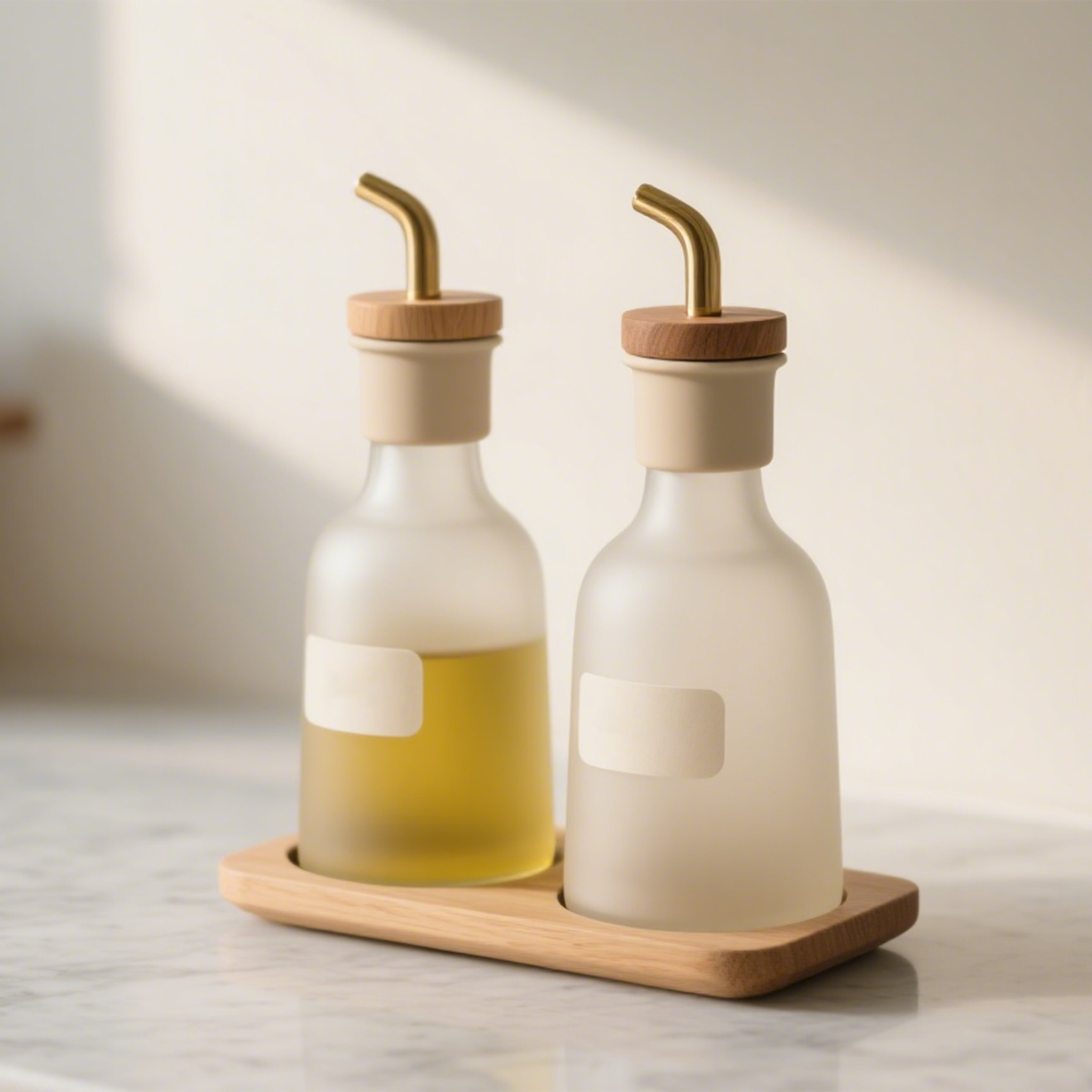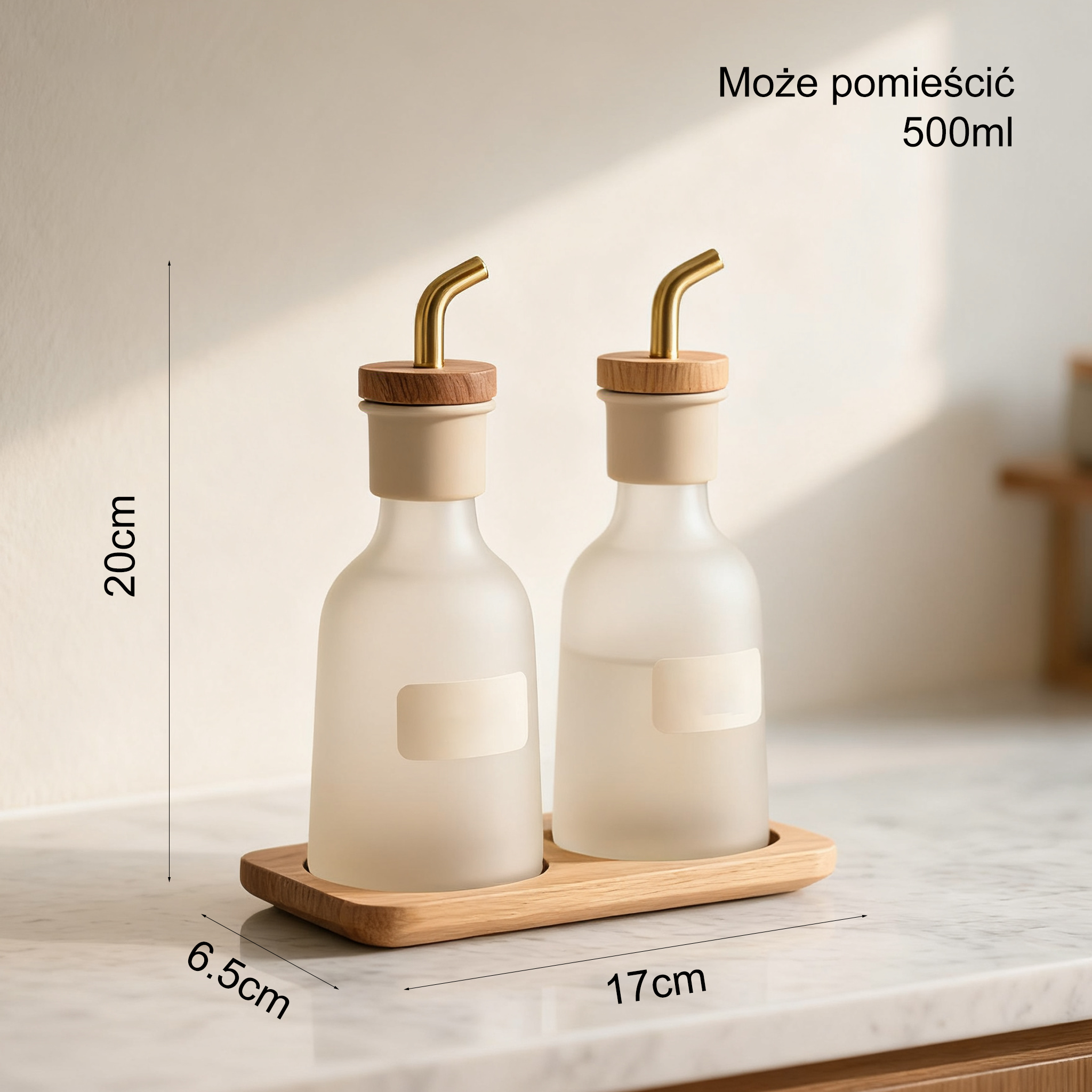 Zestaw butelek na oliwę i ocet ze szkła matowego z drewnianą pokrywką (2 komplety)